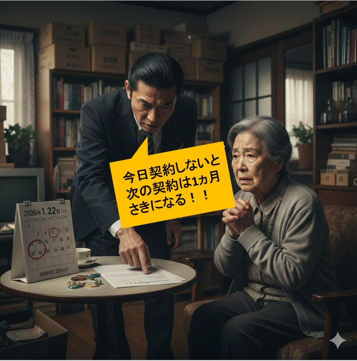 「今日契約しないと、次の空きは1ヶ月先になる」といった言葉で、判断能力が低下している遺族を急かす手口も存在します。士業としては、「一度持ち帰って、法的な観点から私が確認します」と介入し、クライアントに冷静な判断を促す役割を担うべきです。